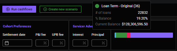Upon selecting a metric, loans are grouped into the respective cohort and the % Bal column populates to display the distribution by outstanding loan balance. There is also a Cohort Distribution bar providing a visual representation of the collateral distribution. Hovering the cursor on this bar will pop-up loan count, % of balance, and total notional balance for that group.