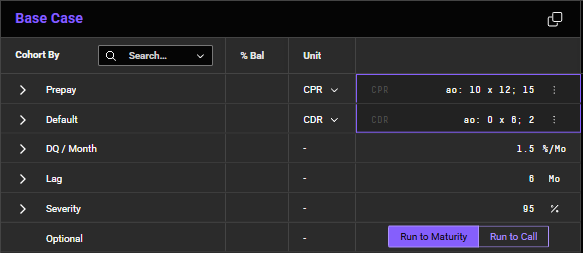 - Prepay curves default to CPR but can be changed to SMM, ABS, or MPR.