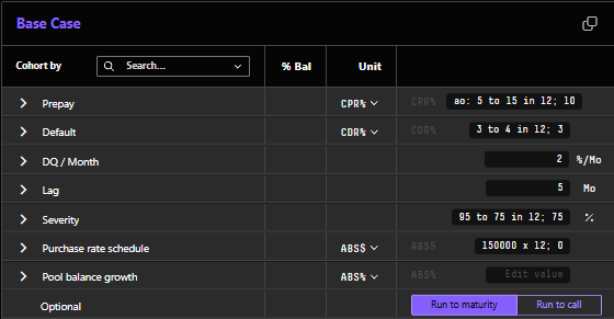 - Purchase rate schedule and Pool balance growth assumptions adds additional loans to the pool. Curves default to ABS$ (adds a fixed dollar amount each month, remains constant), but can be changed to ABS% (adds a fixed % of the initial balance every month, remains constant) or COM% (adds a % of the current balance each month, growth accelerates)