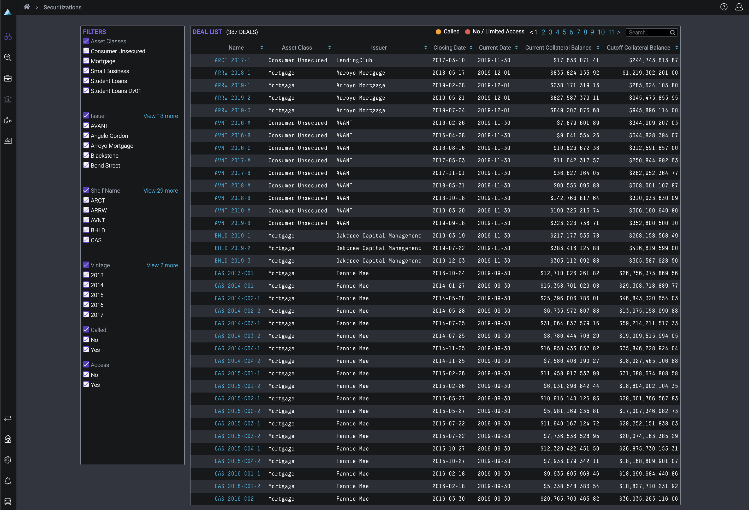 This dashboard provides an overview of Securitizations available on dv01's platform, allowing you to search, filter, and sort by several different attributes, including asset class, issuer, shelf name, vintage, and more. It's accessible by clicking on the Securitization icon on the lefthand navigation.