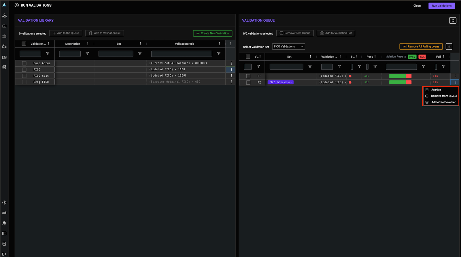 To run the validation set on your loan tape, find the validation set within the Validation Queue drawer, and select Run Validations.