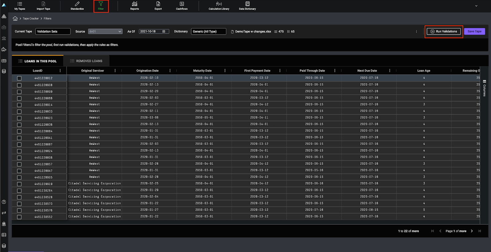 Within a loan tape, navigate to Filters and click Run Validations to view your validation library.