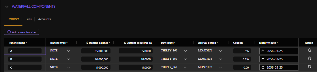 Navigate to Structure > Tranches and create each bond adding details for: name, type, balance, day count, accrual period, coupon, maturity date, coupon cap, and carryover capped interest