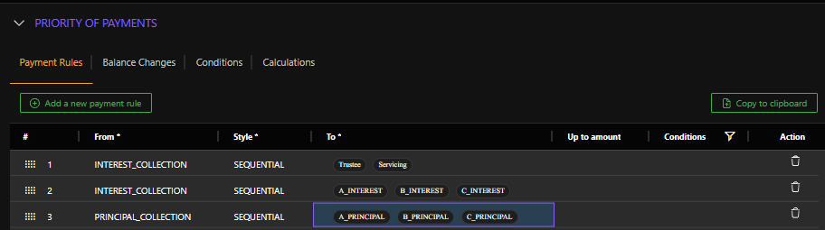 | 3 | Interest_Collection | tranche[A].interest | Sequential | Senior interest |
