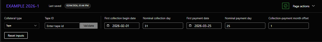 Field Example Value Deal Name EXAMPLE 2026-1First Collection Begin Date 2026-02-01First Payment Date 2026-03-25 - Choose either Replines or Tape to define the collateral.